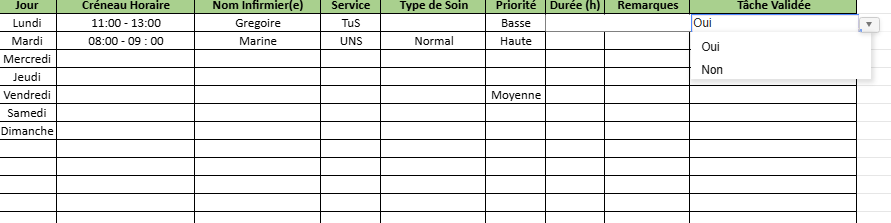 - Tâche validée : case Oui/Non (menu déroulant)