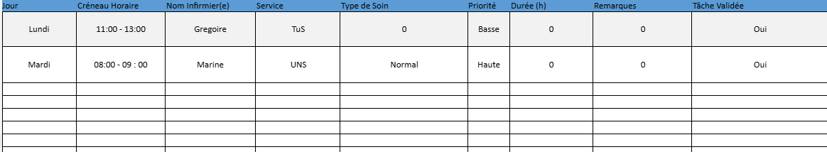 | Centralisation | Tous les soins de la semaine dans un même fichier |