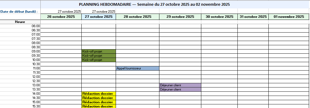 Au cœur du dispositif, une cellule unique — la date de début — sert de point d’ancrage. Saisir un lundi suffit : les en-têtes lun→dim se complètent automatiquement, le numéro de semaine s’actualise et la période affichée s’étend sur sept jours. La colonne du jour est mise en évidence, tandis que le week-end bénéficie d’un code couleur distinct, facilitant l’orientation visuelle.