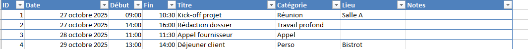 La nouveauté n’est pas tant l’outil que l’usage. Avec des fonctions disponibles depuis des années (recherche, concaténation, calculs de dates), il est possible de transformer une liste brute d’événements en planning vivant : chaque créneau affiche le rendez-vous qui le recouvre, les chevauchements sont gérés, les créneaux vides restent… vides.