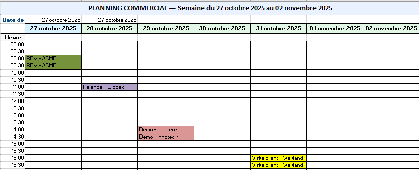 - Commercial / Ventes. Côté terrain, un modèle colorise les catégories (prospection, démonstration, négociation) et relie la semaine affichée à des KPI de pipeline : rendez-vous par étape, montants agrégés. On planifie, on suit, on arbitre — au même endroit.