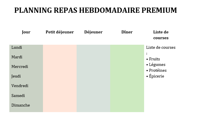 Utilisez les fonctionnalités de tableau de Word pour créer un « planning menu semaine » avec les jours de la semaine en haut et les repas (petit-déjeuner, déjeuner, dîner, collations) en ligne.