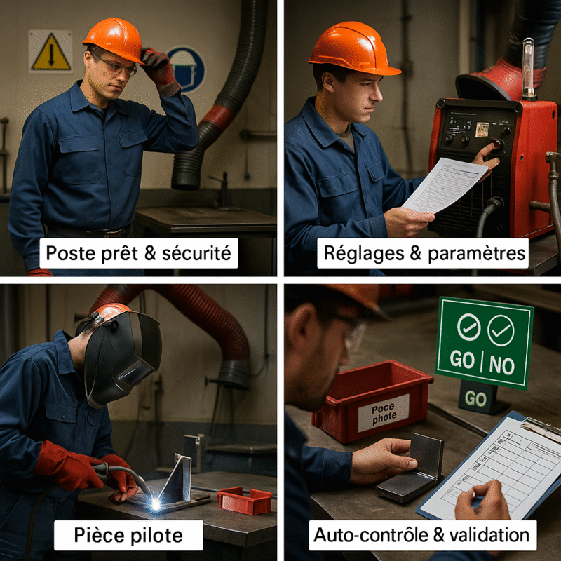 - Doc & traçabilité : OF/lot affiché, plan ou WPS/fiche de réglage à jour, échantillon « or » disponible.