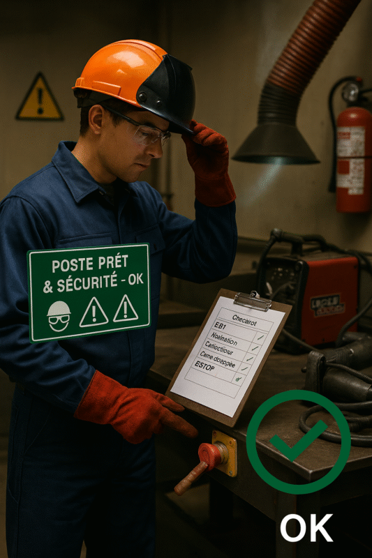 - Objectif : sécuriser le démarrage maîtrisé d’un poste de soudage, rendre les CTQ visibles, tracer l’auto-contrôle et décider Go/No-Go.