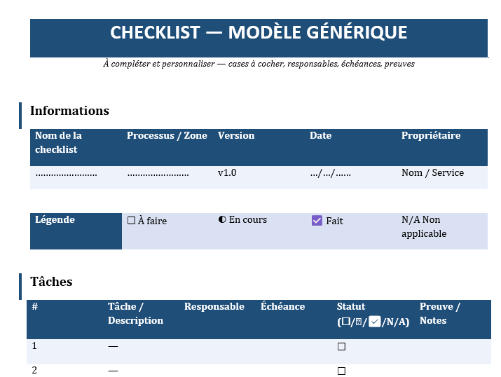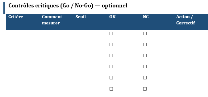 Opérateur (auto-contrôle), Chef d’équipe, Qualité (si requis) → Signature & date — Décision : ☐ GO / ☐ NO-GO.