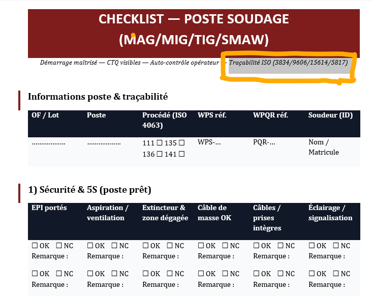 “CHECKLIST — POSTE SOUDAGE (MAG/MIG/TIG/SMAW)” + rappel ISO (3834/9606/15614/5817). - Informations poste & traçabilité (table 2×6)