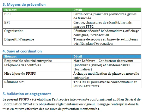 Un PPSPS efficace comprend généralement les rubriques suivantes :