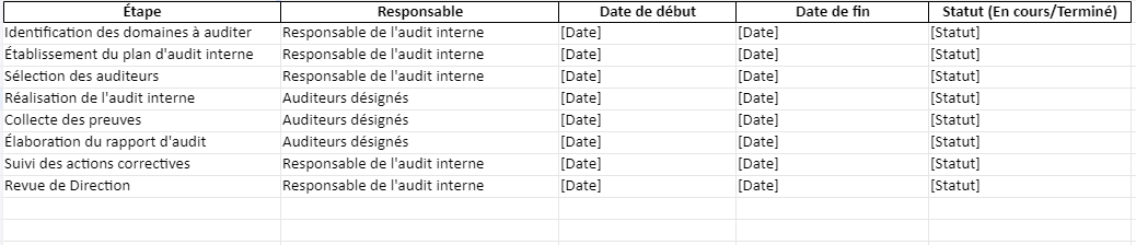 | Identification des domaines à auditer | Responsable de l’audit interne | [Date] | [Date] | [Statut] |