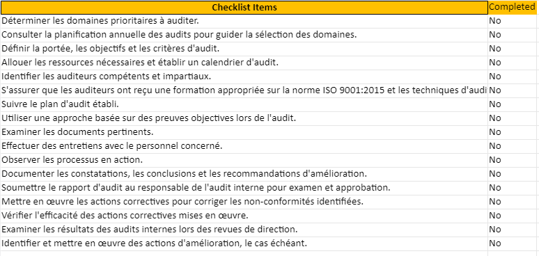 Voici un exemple de tableau à remplir pour la mise en œuvre de la procédure d’audit interne ISO 9001:2015, ainsi qu’une checklist correspondante :