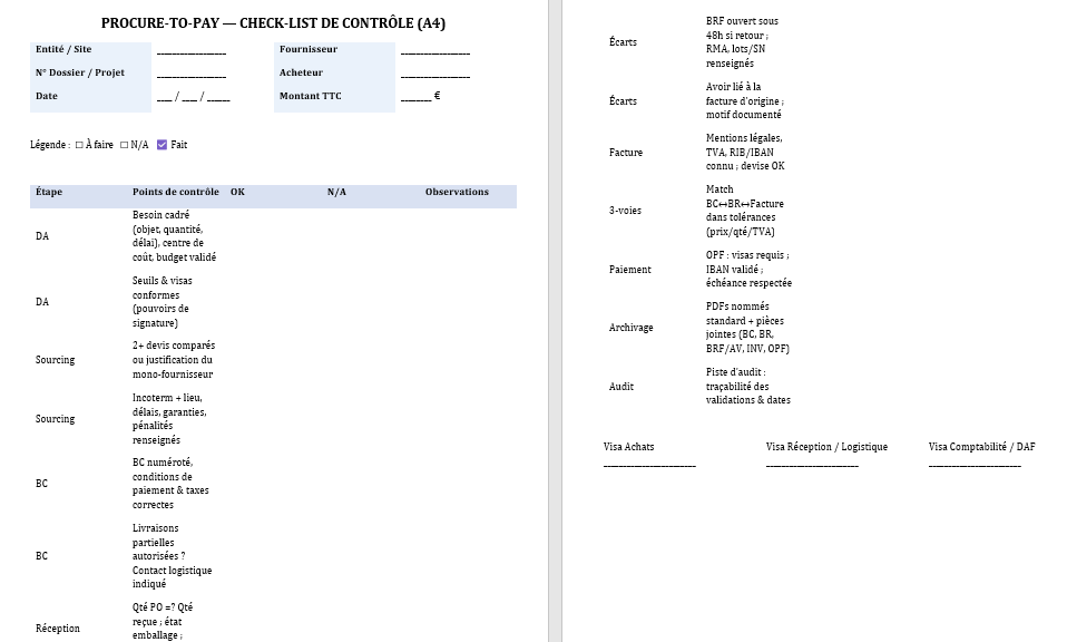 Trame Procure-to-Pay (P2P) — modèle prêt à déployer