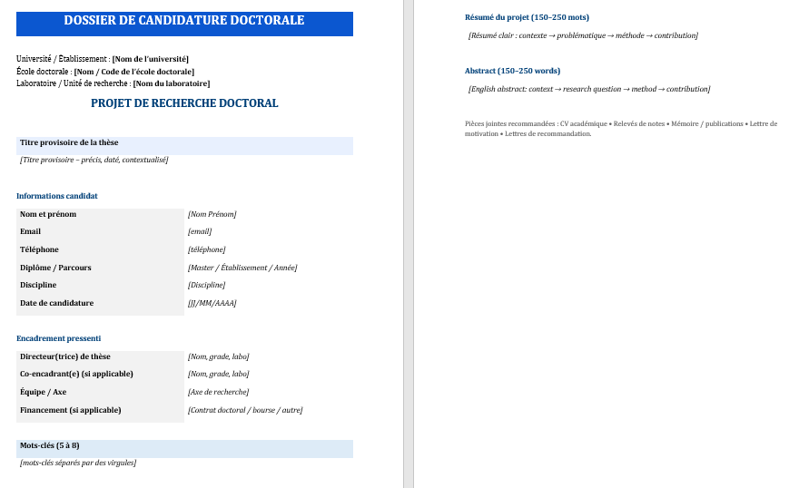 Téléchargez le modèle – projet de recherche doctorale -, suivez la trame, puis transformez votre idée de thèse en projet cohérent, lisible et immédiatement présentable à une école doctorale ou à un directeur de thèse.