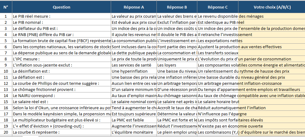 Astuce : si vous segmentez par chapitres (PIB, inflation, etc.), ajoutez une colonne « Thème » et calculez un score par thème (sous-totaux + quelques graphiques). Cela transforme le QCM en outil de pilotage pédagogique.