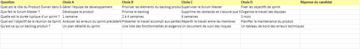 Voici un QCM sur Scrum spécialement conçu pour un entretien de Scrum Master, avec des icônes (pictogrammes) imaginaires qui pourraient être inclus pour faciliter l’interaction. Vous pouvez utiliser ce modèle pour évaluer les compétences et les connaissances d’un candidat pour le rôle de Scrum Master.