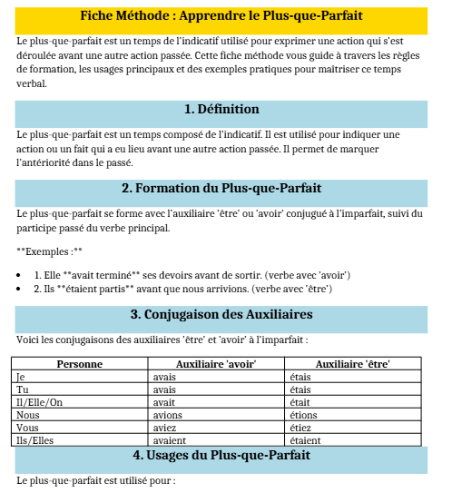 La fiche méthode « Apprendre le Plus-que-Parfait » est un outil pédagogique conçu pour faciliter l’apprentissage de ce temps verbal complexe mais essentiel. Elle est organisée de manière claire et progressive, avec des sections bien définies et des exemples concrets pour renforcer la compréhension.