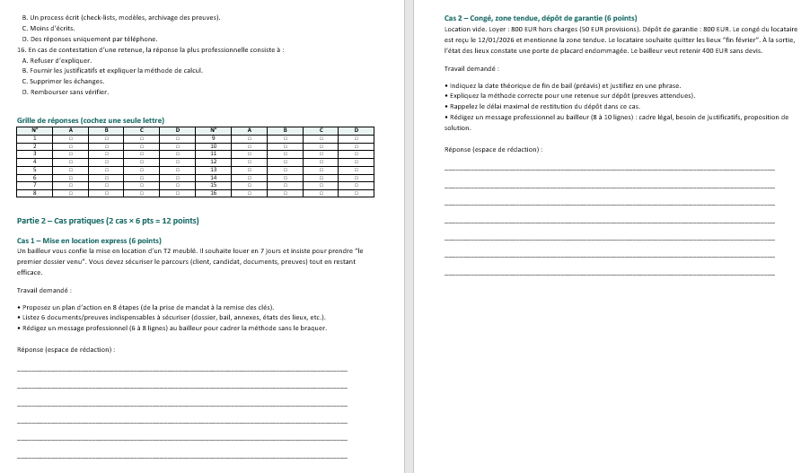 Repères juridiques (France) utiles pour certaines questions : préavis location vide = 3 mois (cas général), 1 mois en zone tendue si mentionné dans le congé ; dépôt de garantie en location vide ≤ 1 mois de loyer hors charges ; restitution dépôt : 1 mois si état des lieux conforme / 2 mois si non conforme ; bail mobilité : 1 à 10 mois, non renouvelable, pas de dépôt de garantie, préavis locataire = 1 mois.