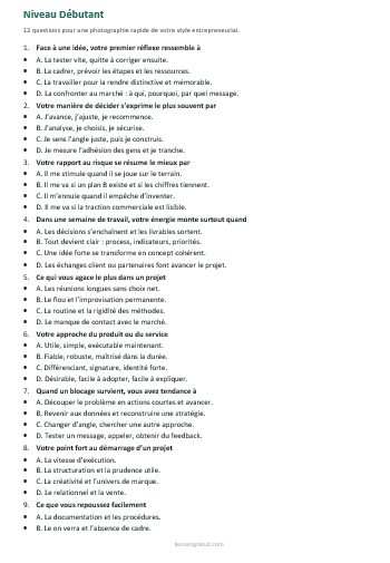Le niveau débutant mesure l’élan naturel : votre rapport à l’action, au risque, à l’organisation, et à l’exposition commerciale. Les questions sont courtes, directes, et permettent de dégager un premier profil dominant sans ambiguïté inutile.