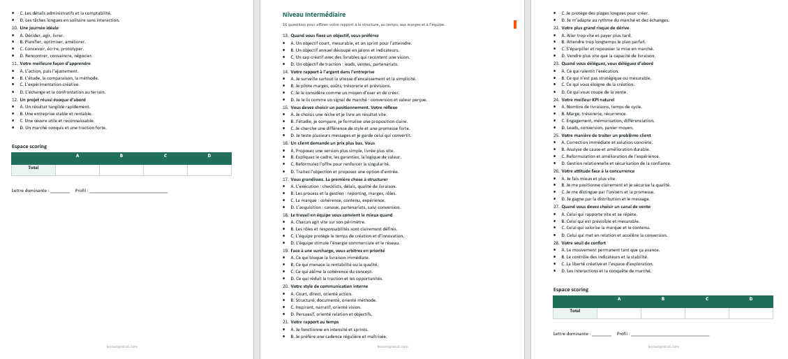 On y retrouve trois niveaux progressifs, une feuille de scoring claire, des profils détaillés, et des recommandations d’orientation qui évitent les conseils génériques. L’objectif reste le même : vous aider à faire des choix cohérents, non à produire un résultat flatteur.
