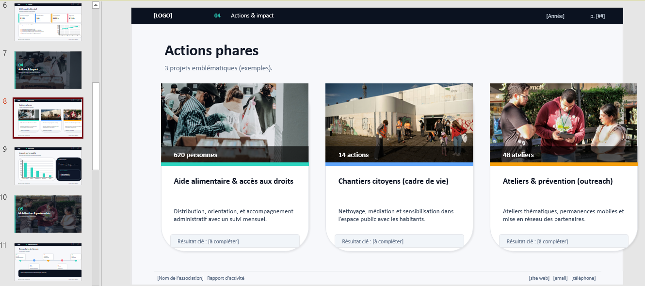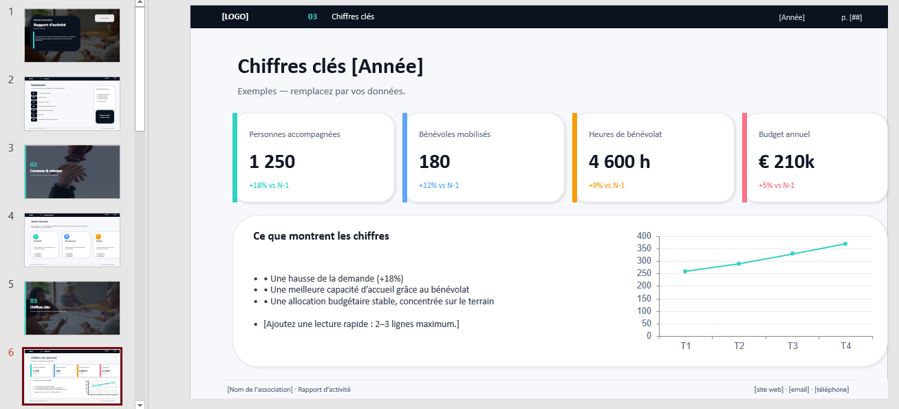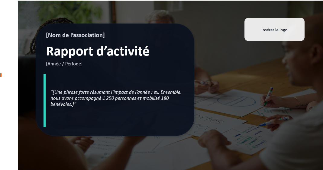 Dans beaucoup d’associations, le rapport se fabrique en temps limité, parfois le soir, parfois entre deux urgences. Un modèle PPT évite de repartir de zéro, sécurise la structure, et donne un cadre qui “tient” même lorsque l’on ne dispose pas de toutes les données. Le document conserve une allure professionnelle, sans exiger une production lourde.