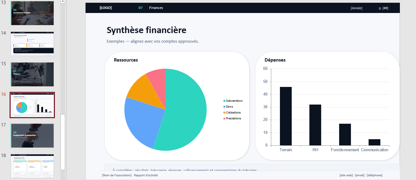 Tout est éditable dans PowerPoint : textes, blocs, pictogrammes, graphiques, zones logo, couleurs et sections. Le modèle est conçu pour être complété progressivement, même avec une organisation associative où le temps manque et où les informations ne sont pas toujours centralisées.