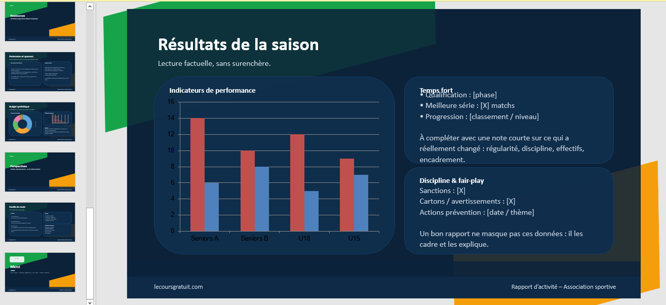 Ce modèle ne cherche pas la perfection froide. Il vise plutôt une présentation solide, claire et “tenable” dans la vraie vie d’un club : on peut le remplir vite, l’améliorer chaque année, et conserver une cohérence d’une saison à l’autre. C’est exactement ce qui donne au rapport une valeur durable.