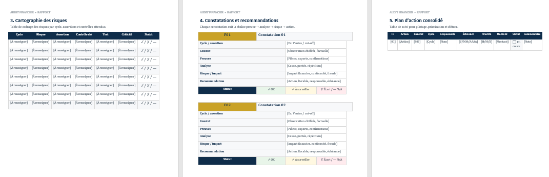 Un rapport d’audit financier ne se termine pas au diagnostic. Il se termine au plan d’action. Un modèle Word doit donc produire un tableau de synthèse : actions, responsables, échéances, priorité, statut. C’est ce bloc qui rend le rapport utile au-delà de la lecture initiale.