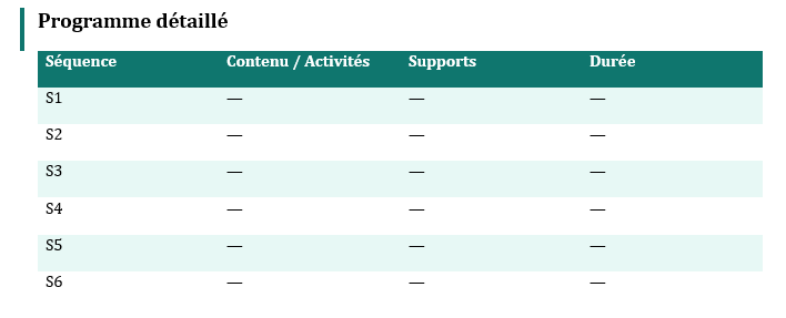 - Dates & durée : horaires, format (présentiel, atelier terrain, mixte).