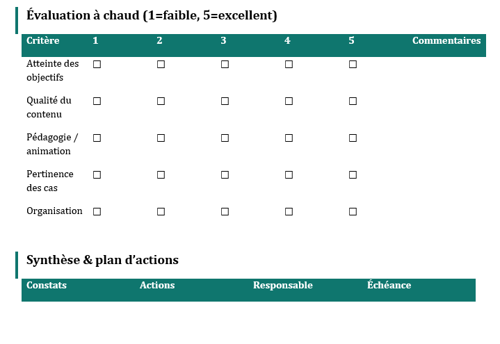 Table critères + cases 1-5 + commentaires (Atteinte objectifs, Qualité contenu, Pédagogie, Pertinence des cas, Organisation). - Synthèse & plan d’actions
