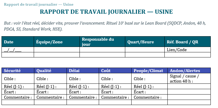 Le rapport de travail journalier n’est efficace que s’il condense l’essentiel : l’état réel, l’action précise, la preuve attendue, l’échéance tenue. Avec les trois modèles (Lean, Atelier, Usine), vous disposez d’un format sobre et commun : on voit, on agit, on prouve. C’est ce qui transforme un rituel en résultats, et des résultats en standards qui durent.