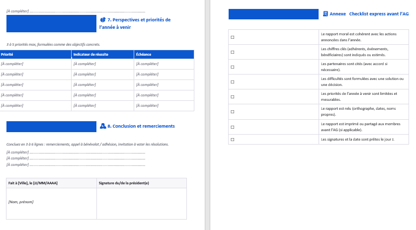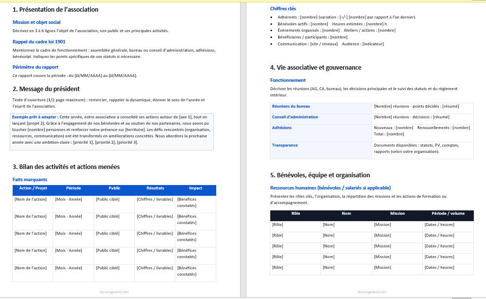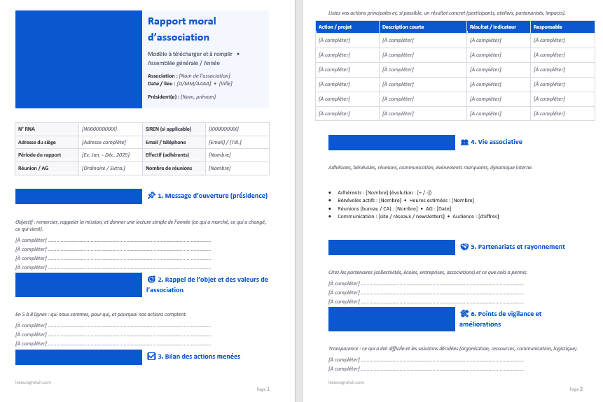 Le modèle est déjà mis en page (titres, encadrés, tableaux), ce qui permet de gagner du temps tout en produisant un rapport moral clair, professionnel et conforme aux usages des associations loi 1901.