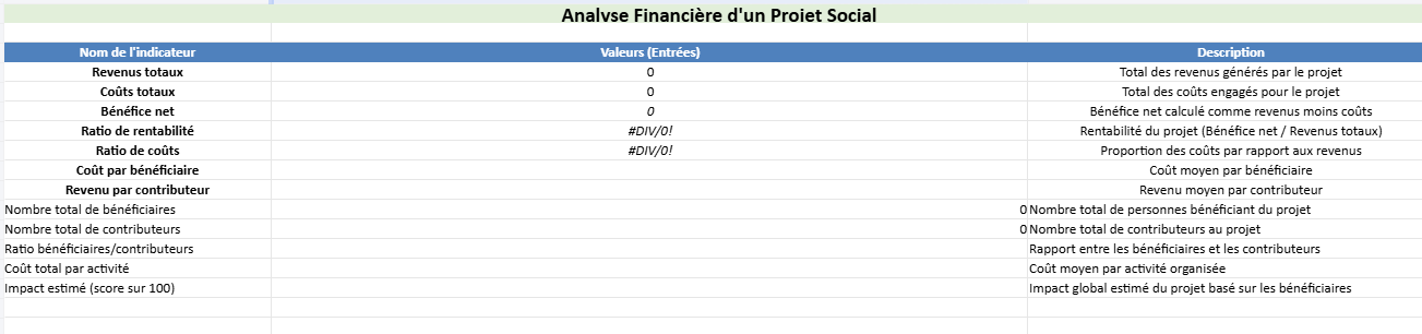Ce modèle Excel a été conçu pour automatiser le calcul de plusieurs indicateurs financiers et sociaux clés d’un projet. Les formules sont déjà intégrées, ce qui facilite la gestion et l’analyse des données. Voici un guide pour utiliser efficacement ce modèle.