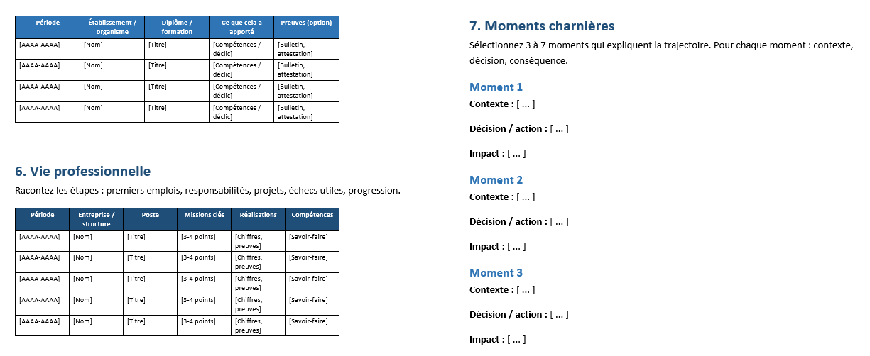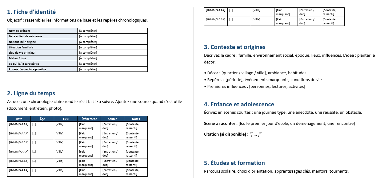 Commencez par une chronologie brute (même incomplète), puis entourez 3 à 5 moments charnières : première rupture, décision, réussite, échec fondateur, rencontre déterminante, départ, retour, engagement.