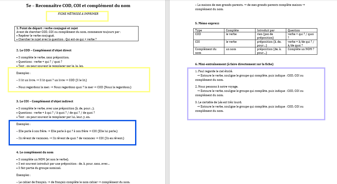 1. Fiche 5e – COD, COI et complément du nom – Fiche méthode à imprimer