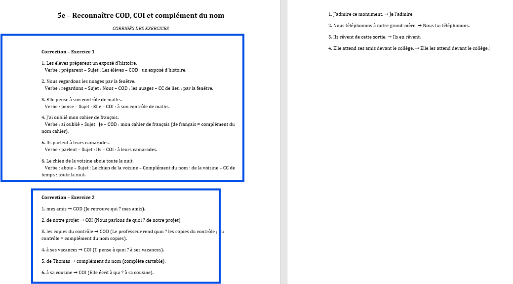 3. Fiche 5e – COD, COI et complément du nom – Fiche corrigés
