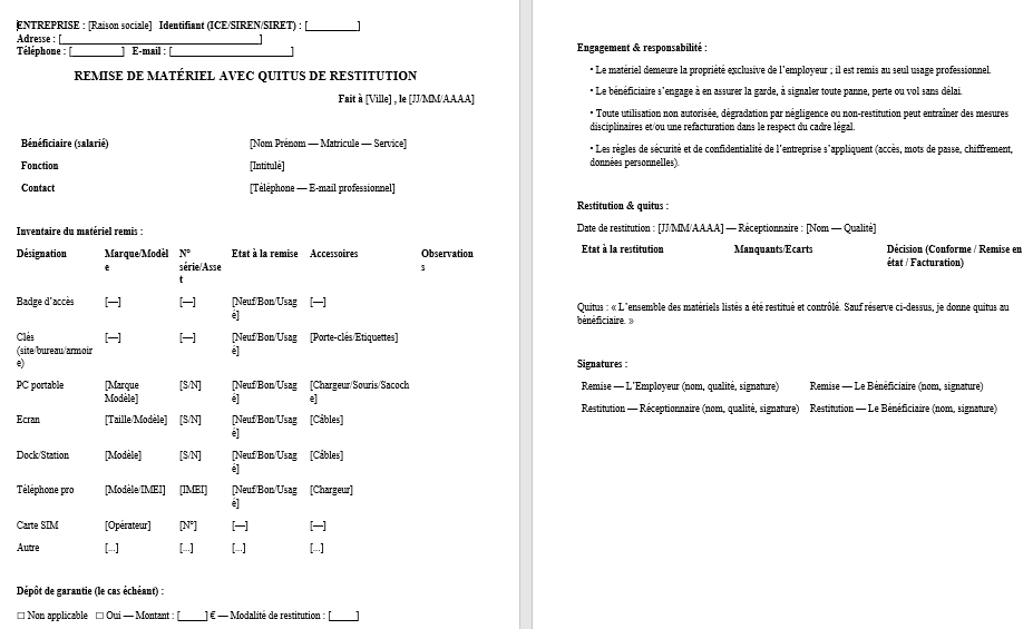 À l’échéance du besoin, sur demande de l’employeur ou à la fin du contrat, le matériel est restitué complet à [Lieu/Service] contre contrôle contradictoire. Tout retard, manquant ou dégradation imputable à une négligence avérée peut donner lieu, dans le respect du cadre légal et disciplinaire, à une facturation de remise en état ou de remplacement.