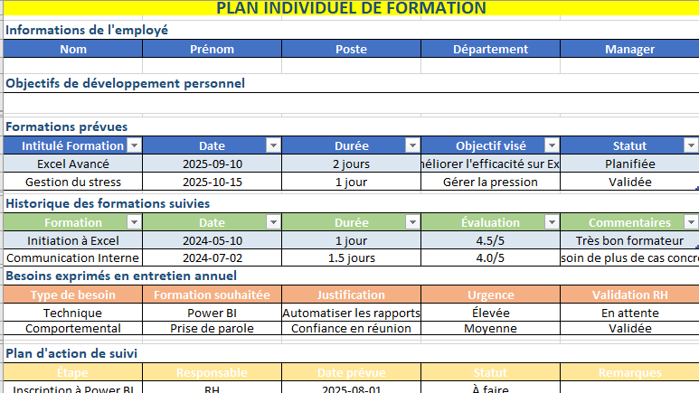 Modèle Excel de Plan Individuel de Formation : structure complète pour un suivi personnalisé et opérationnel