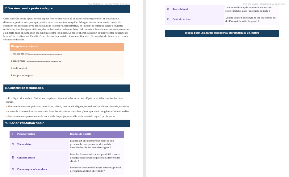 D’abord, situer le rôle de la note d’intention dans un projet artistique. Ensuite, expliquer ce qui distingue la comédie des autres registres. Puis, montrer ce que le cadre franco-américain apporte en termes de conflit, de rythme et de matière humaine. Après cela, détailler les éléments qu’une note réussie doit contenir. Enfin, ouvrir sur les qualités d’écriture attendues : précision, nuance, musicalité, densité du regard.