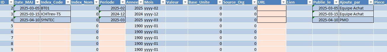 - Saisir dans le Registre : pour chaque indice, ajoutez une ligne avec Date_MAJ, Index_Code, Période, URL et, si possible, la Valeur.