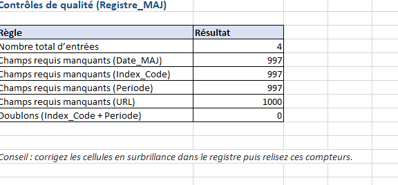 - Contrôles intégrés (mise en évidence) : champs requis vides (Date_MAJ, Index_Code, Période, URL) et doublons.