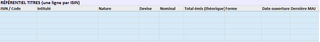 - ISIN / Code (unique), Nature (actions, parts, obligations), Devise, Nominal, Total émis (théorique), Forme (nominatif/démat.), Dates (ouverture/dernière MAJ).
