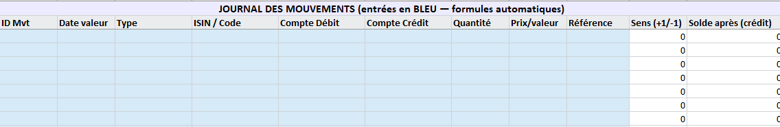 ID Mvt · Date valeur · Type (Entrée/Sortie/Transfert/Annulation) · ISIN · Compte Débit · Compte Crédit · Quantité · Prix/valeur · Référence (ordre/contrat) · Sens (+1/−1) · Solde après. - Sens dérivé du Type (Entrée/Transfert = +1 ; Sortie/Annulation = −1).