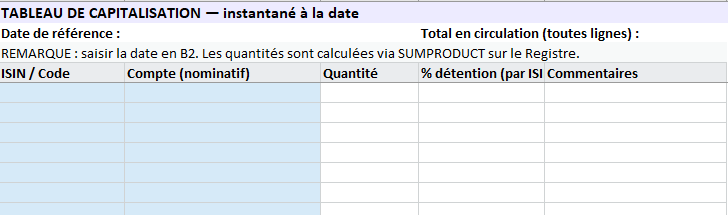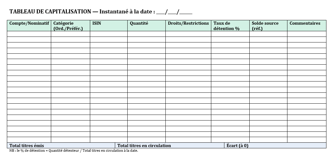 - Titre : “TABLEAU DE CAPITALISATION — Instantané à la date : //______”.