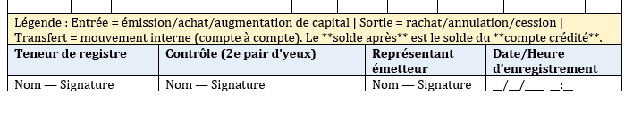 - Titre : “REGISTRE DE MOUVEMENT DE TITRES — DÉMATÉRIALISÉ” (style sobre, charcoal).