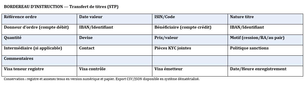 - “BORDEREAU D’INSTRUCTION — Transfert de titres (STP)”.