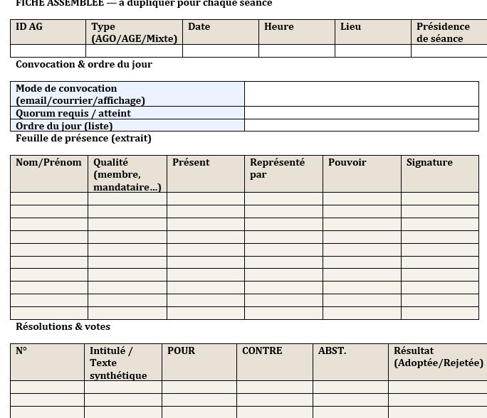 - Dupliquez cette page pour chaque AG (ID + Type + Date/Heure + Lieu + Président).