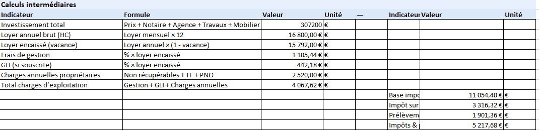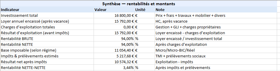 - Montants clés en € (investissement, loyers, charges, impôts, résultat net).