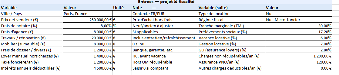 - Ouvrez 1_Inputs → remplissez prix, frais, loyers, % (vacance/gestion/GLI), charges, fiscalité.