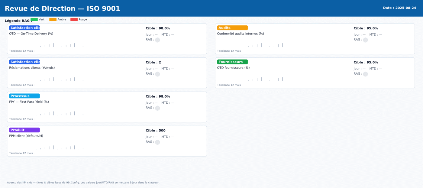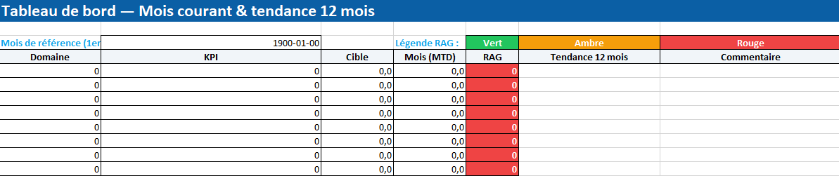 - 20_Tableau_de_Bord : 6–8 KPI Cible / MTD / RAG / Tendance 12 mois (+ commentaires).