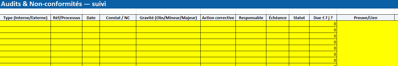 - Audits & NC (gravité, cause, action, responsable, due date, retard en rouge),