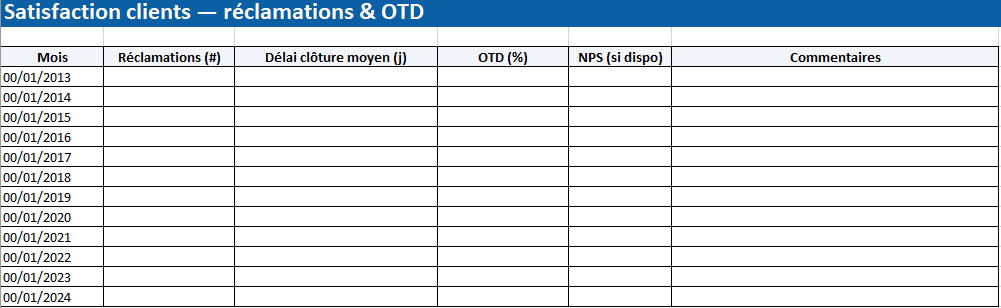 - 25_Satisfaction_Clients : suivi mensuel (réclamations, délai de clôture, OTD, NPS).