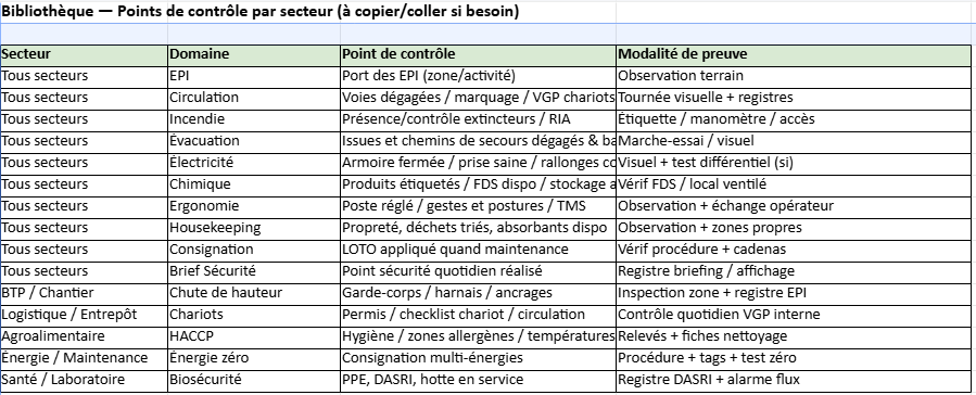 - Tous secteurs : EPI, circulation (VGP chariots), incendie (RIA/extincteurs), évacuation (chemins libres), électricité (armoires fermées, différentiel), chimique (FDS), ergonomie/TMS, housekeeping, LOTO, brief sécurité quotidien.